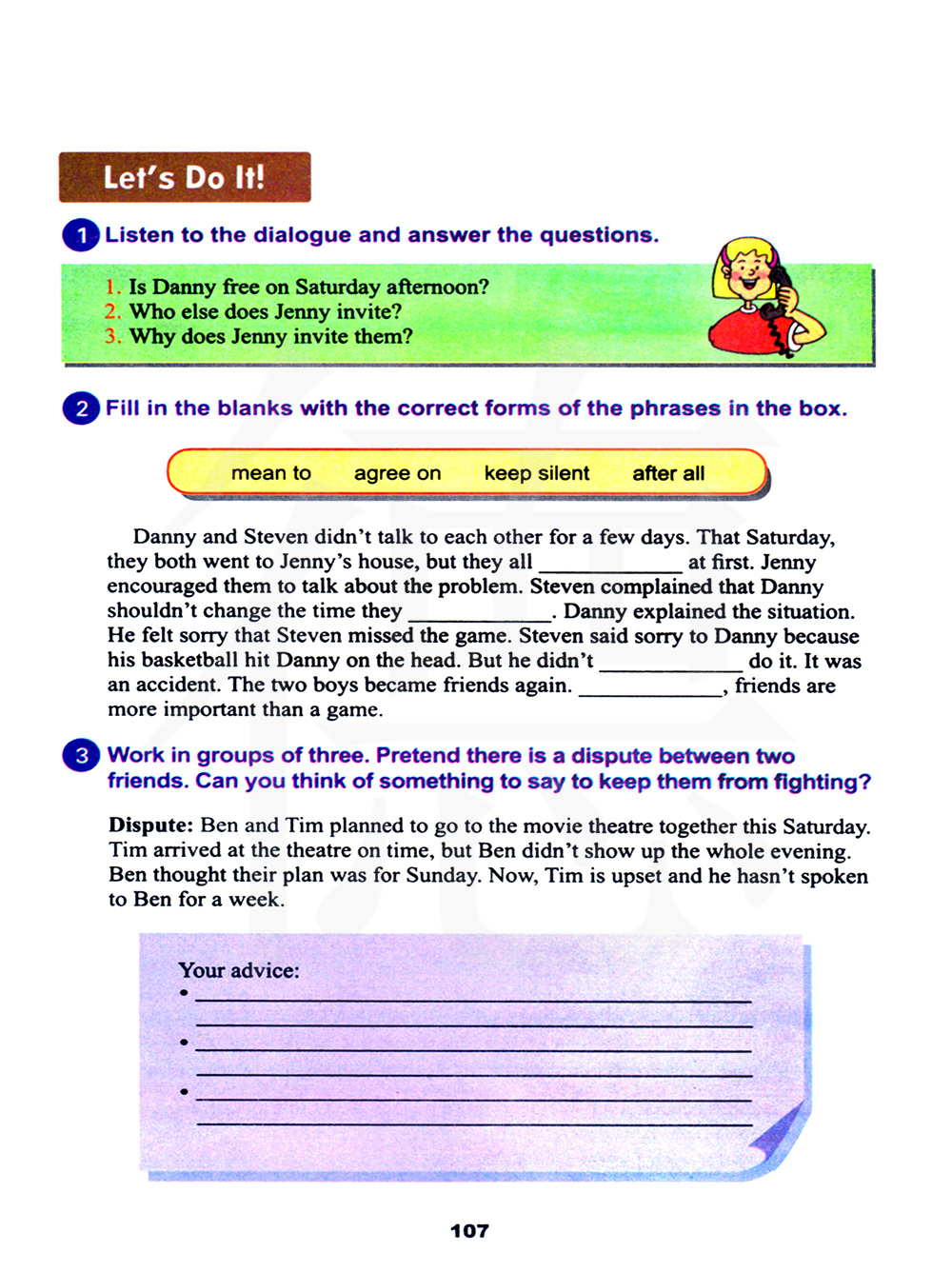 3 三人一组合作。假装两个朋友有争吵。你能想到他们要说些什么使他们停止争吵吗?