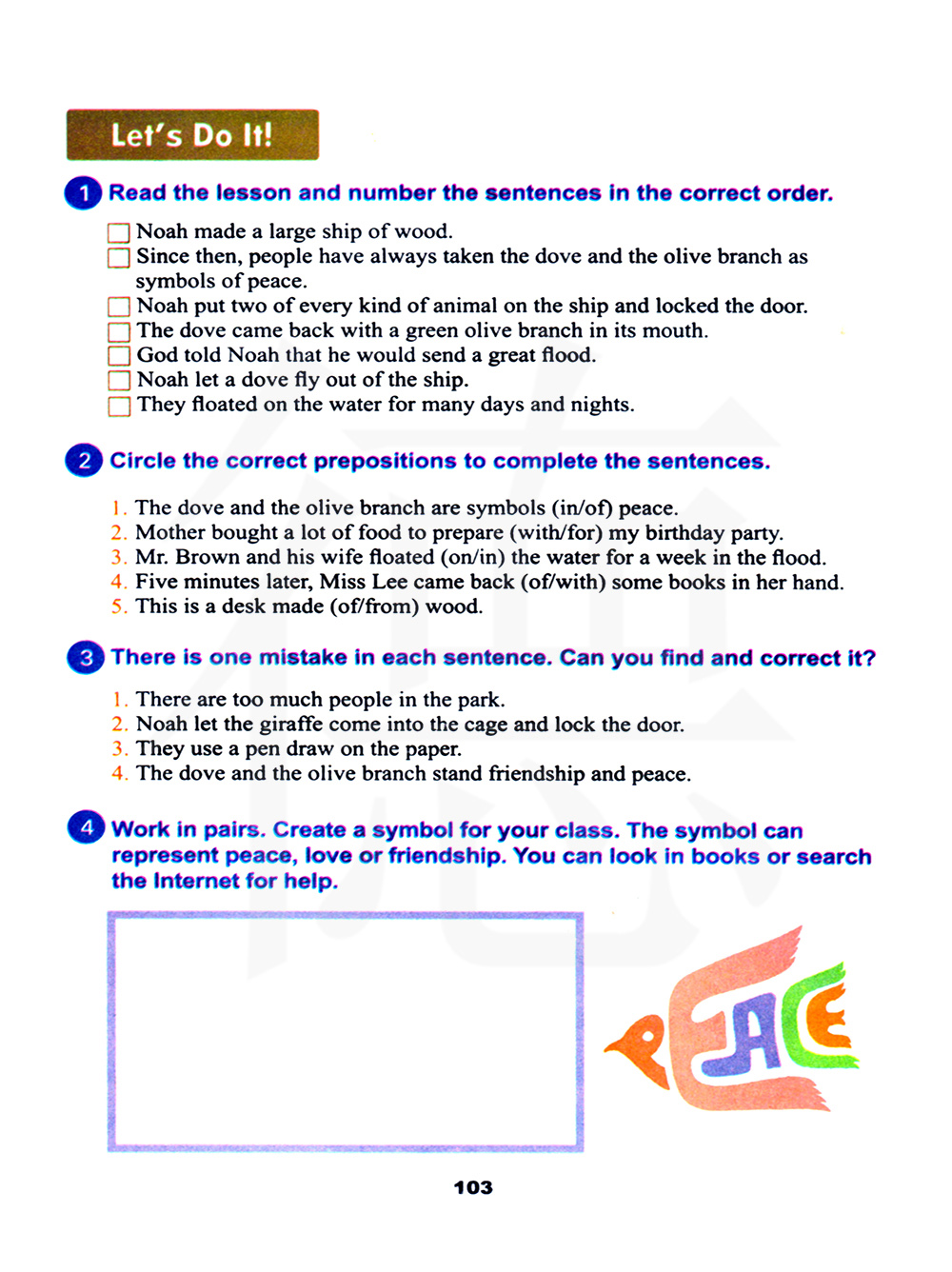 诺亚做了一艘很大的木船。从那以后,人们把鸽子和橄榄枝作为和平的象征。