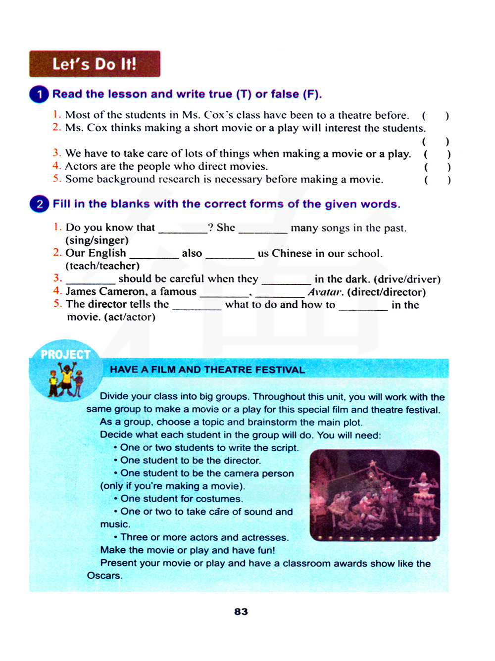 1 科克斯老师班里的大多数同学以前都去过电影院。2 科克斯老师认为拍一场短的电影或者戏剧会使学生们感兴趣。