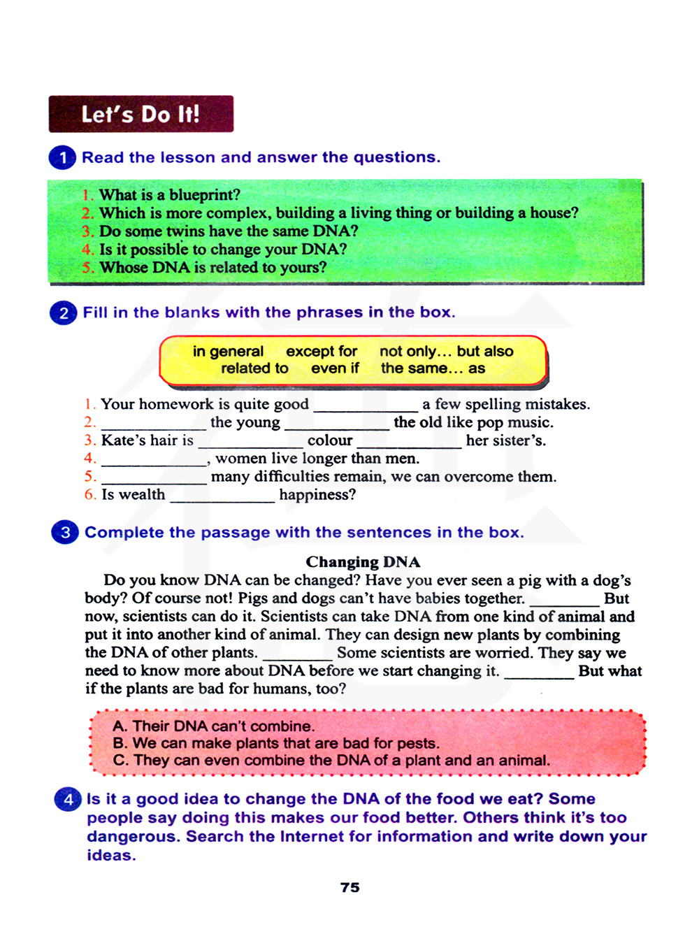 4 改变我们吃的植物的DNA十个好主意吗?有些人说这种做法使得我们的食物变得更好。其他人认为这样太危险。在网上查找信息,并写下你的想法。4 改变我们吃的植物的DNA十个好主意吗?有些人说这种做法使得我们的食物变得更好。其他人认为这样太危险。在网上查找信息,并写下你的想法。