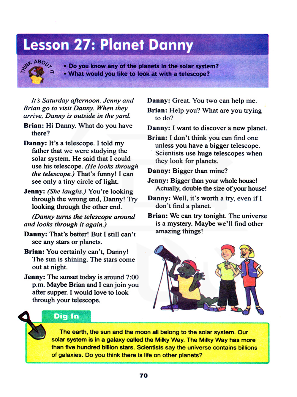 你还,丹尼。你那有什么?他是个望远镜。我告诉我爸爸我们正在学习太阳系。他说我可以用她的望远镜。(它从望远镜中望去)。真有趣!我只能看到一个小小的光圈。