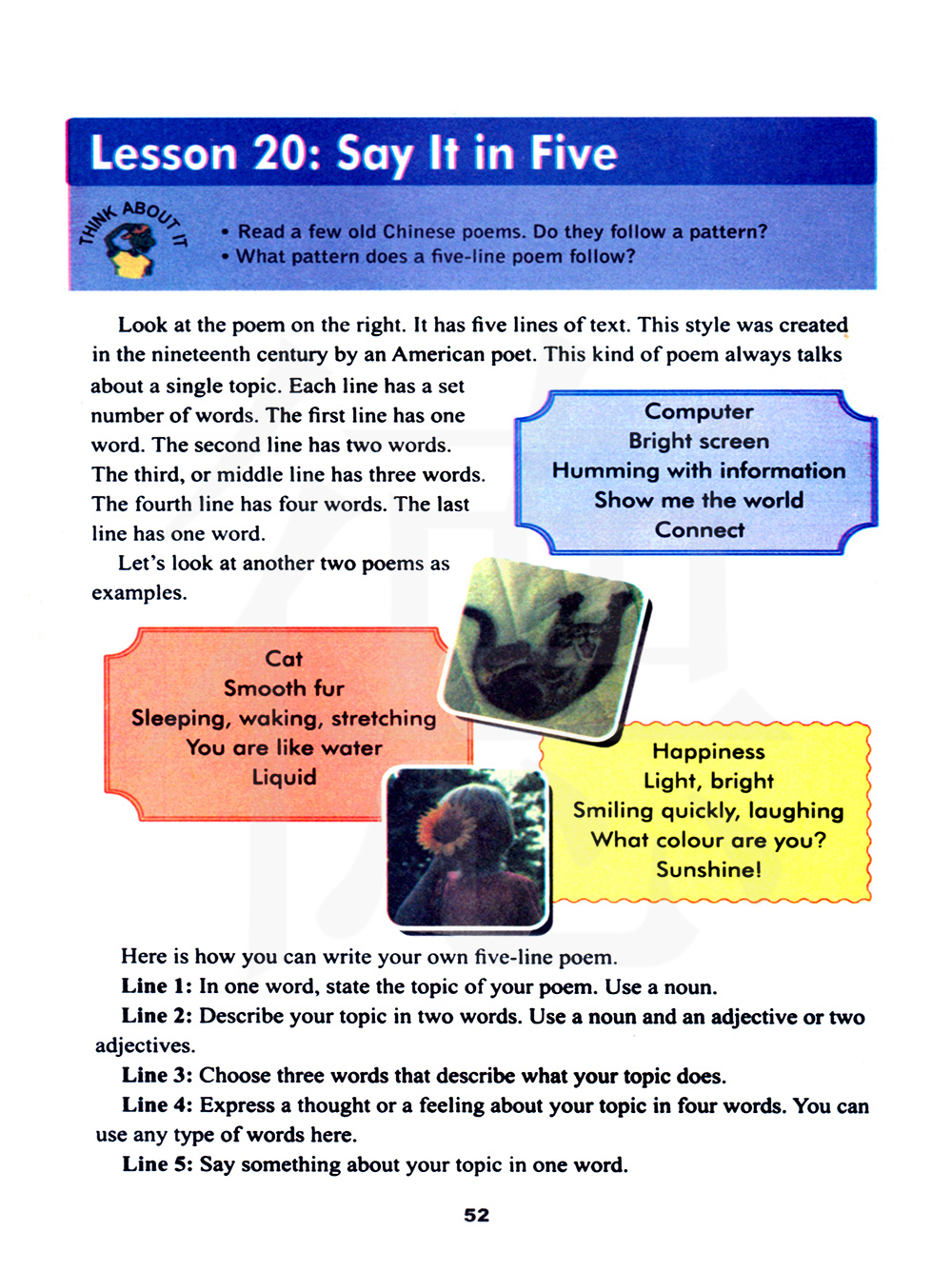 看右边的诗,每个文本有五行。这种类型是由十九世纪的一个美国诗人创造的。这种类型的诗通常只讨论一个简单的简单的主题。每一横都有一组固定树木的词。第一行有一个词,第二行有两个词,第三行有三个词,第四行有四个词,最后一行有一个单词。