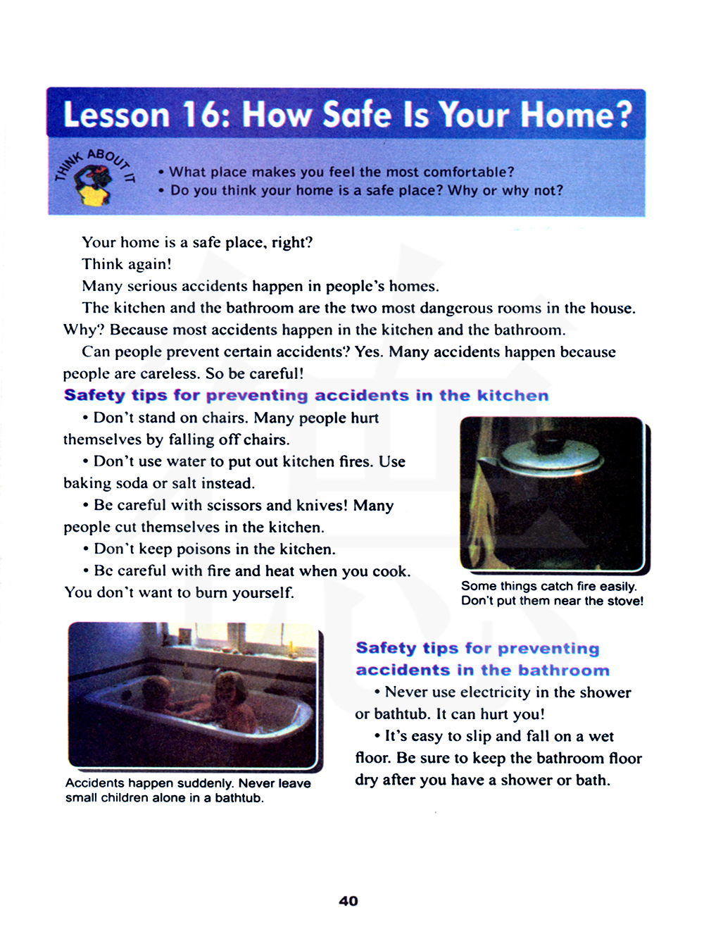 不要站在椅子上。很多人从椅子上摔下来伤了自己。不要用水去灭厨房里的火。用小苏打或盐代替。