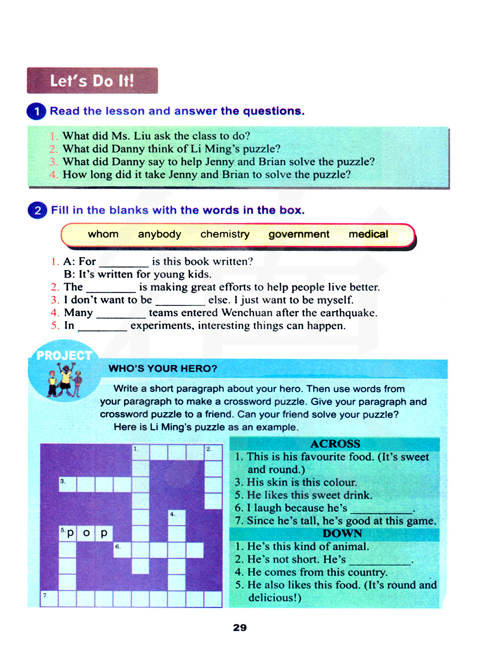 写一段关于你的英雄的小段落。然后用你段落里的词来做一个填字游戏。把你段落和填字游戏给你的朋友,你的朋友能解答你的谜题吗?这里以李明的谜题为例。