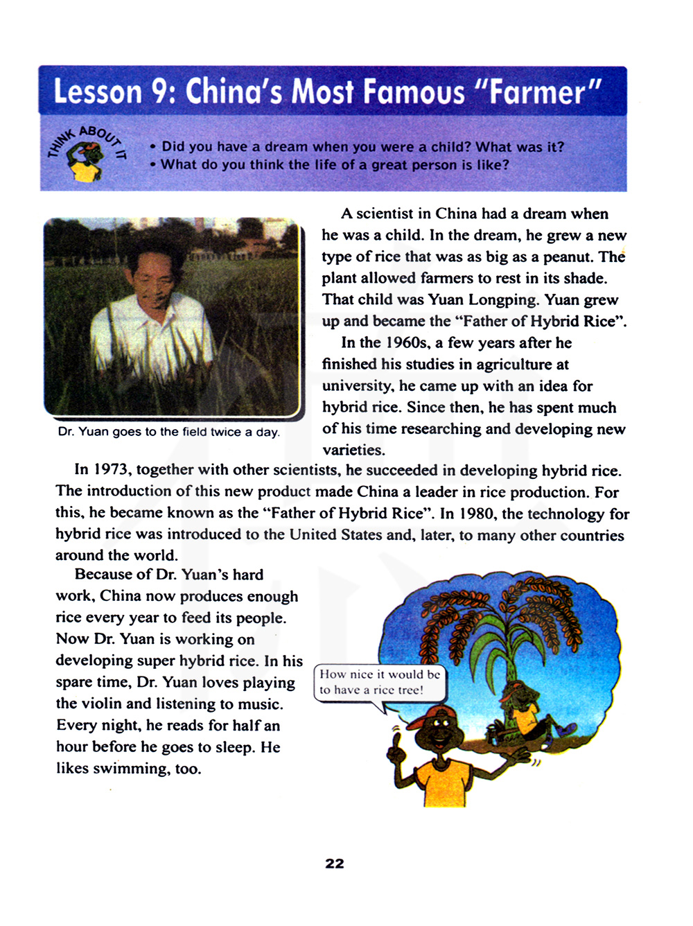 由于袁博士的辛勤工作,中国现在每年生产足够的大米来养活它的人民。现在袁博士正在研制超级杂交水稻。在他的(怎样的老鼠是多么的浪费时间,袁博士喜欢玩o有一棵米树!小提琴和听音乐。每天晚上,他都要在睡觉前读半个小时。他也喜欢游泳