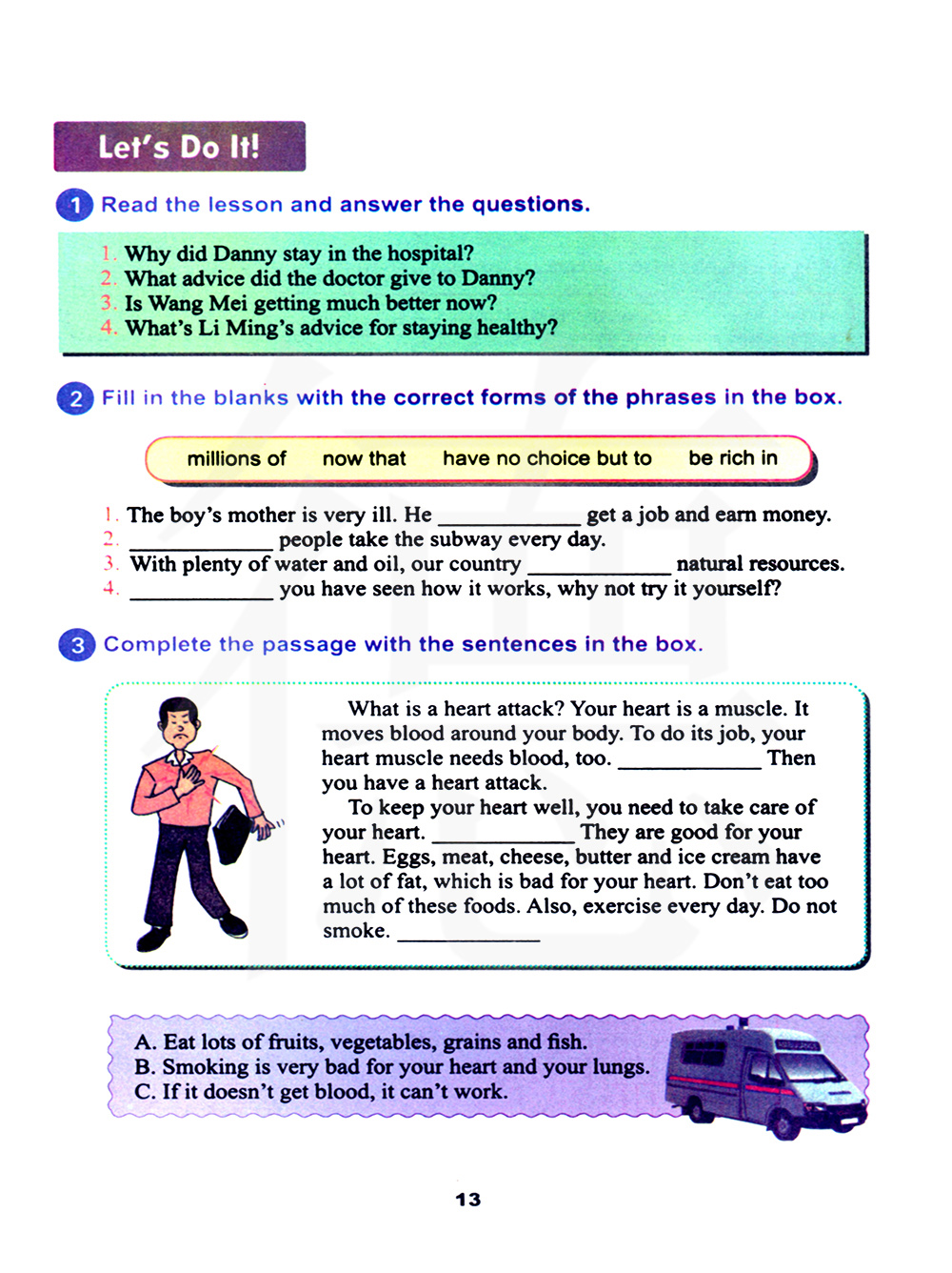 1 丹尼为什么留在医院?2 医生给了丹尼什么建议?3 王梅现在好多了吗?4 李明对保持健康有什么建议?