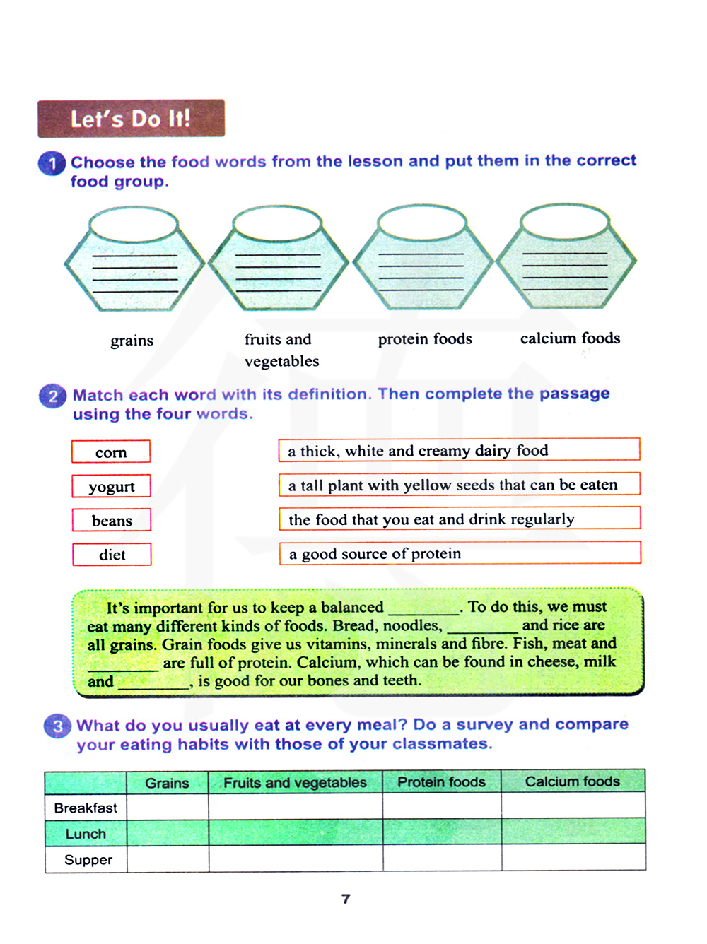 1 从课文里选出表示事物的单词,把他们放在正确的食物组里面。