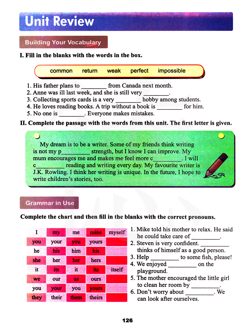 普通的,一般的 返回,回应 弱的,有气无力的 美好的,完美的,理想的 不可能的