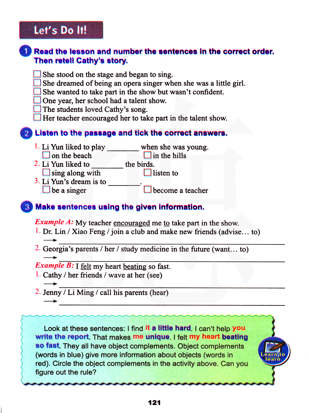 看这些句子,我觉得有点难,我不能帮你写报告,那使我独一无二,我感到我的心跳的非常快,他们都有宾语补足语,宾语补足语,蓝色的单词给宾语,红色的单词提供更多信息,圈出以上活动中的宾语补足语,你能找出规律吗