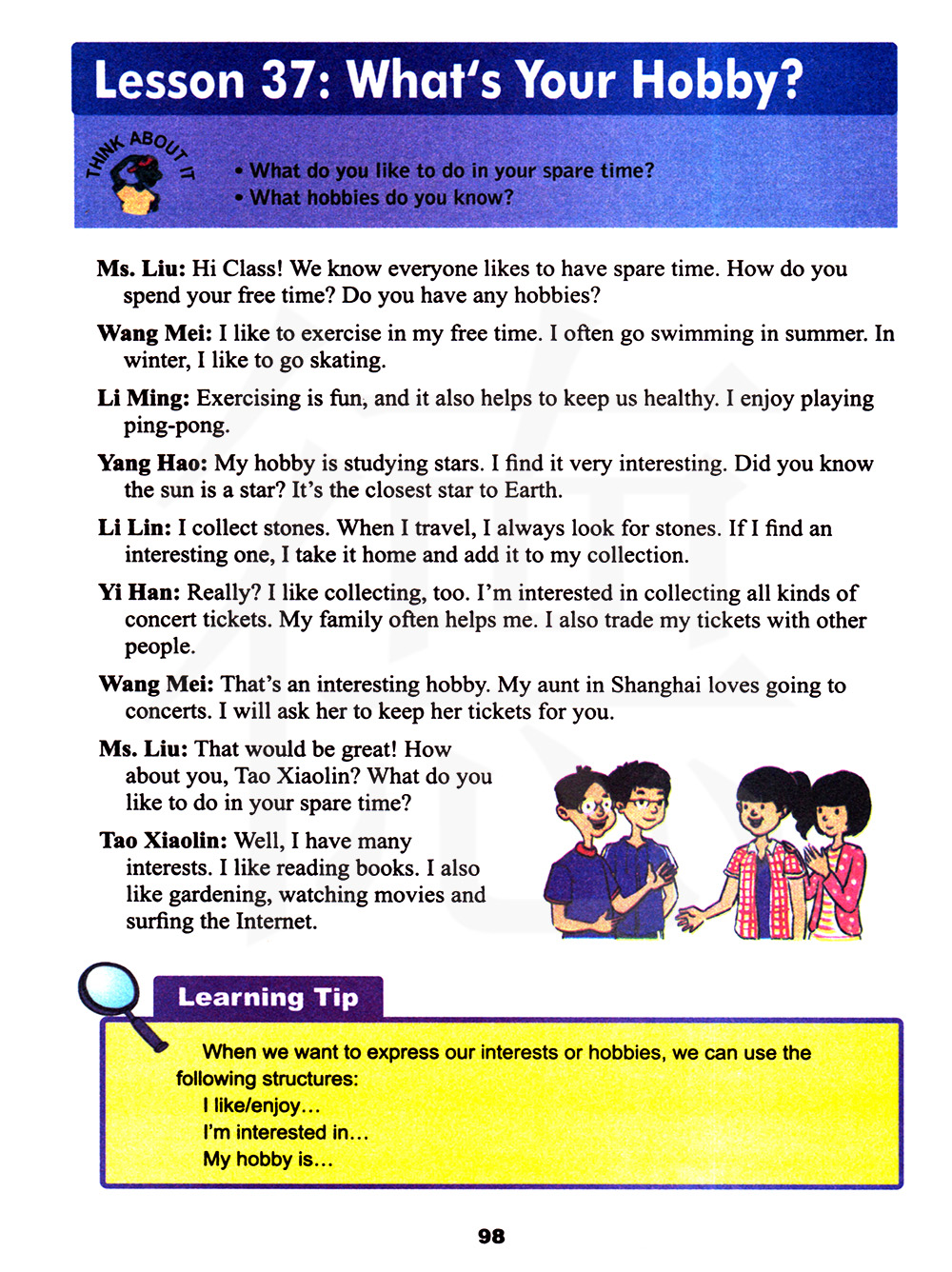 1. ---What's your hobby? ---My hobby is... / I'm interested in... / I like(love)to do sth.(doing sth.) /I enjoy (doing)sth.