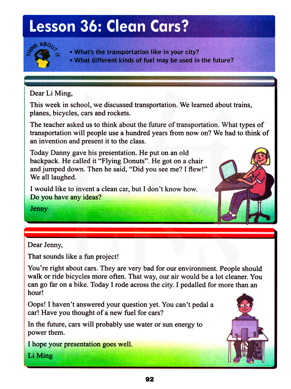 哎呀!我还没有回答你的问题呢!你不能骑汽车!你为汽车想出了一种新燃料吗?在未来,汽车将可能用水或太阳能来提供动力。