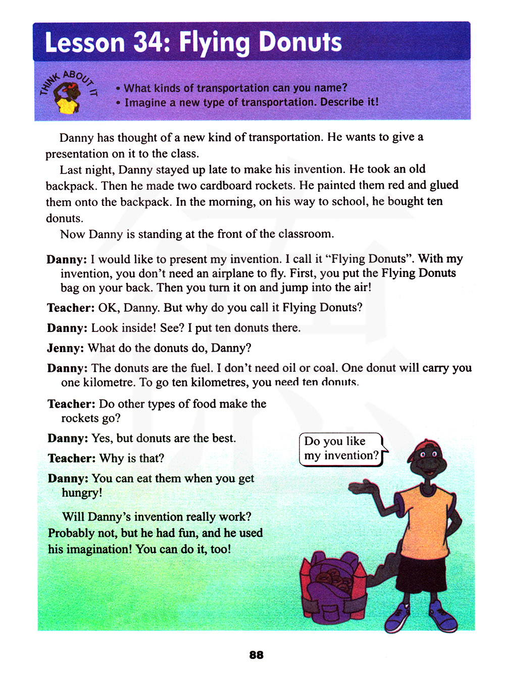 昨晚丹尼熬夜来制作他的发明,他拿来一个旧书包,然后他做了两个硬纸板火箭,他把它们涂上红色并用胶水把它们沾在背包上,早上在他上学的路上,他买了十个甜甜圈。