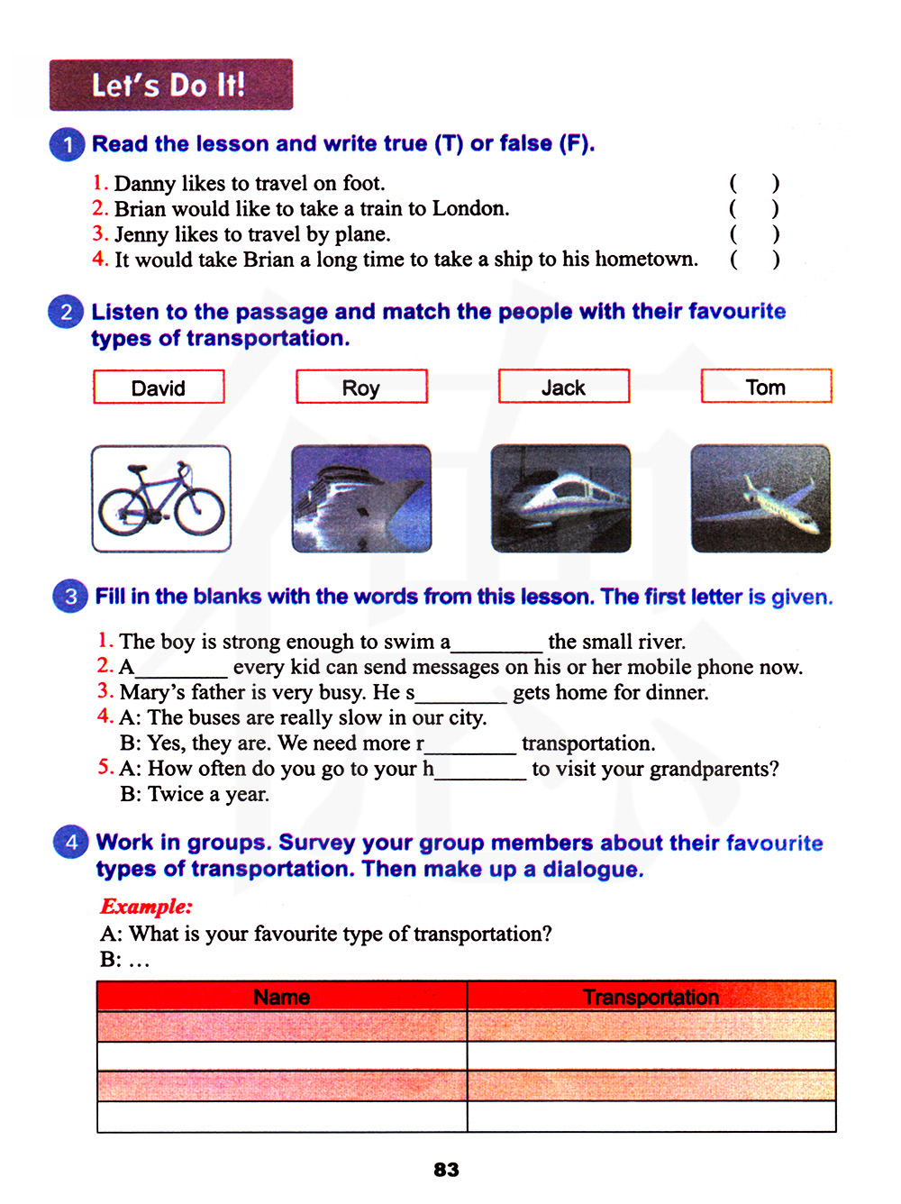小组练习,调查你的组员他们最喜欢的交通方式,然后编一段对话。