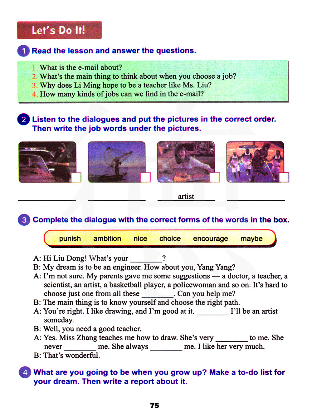 听对话,并把这些图片按正确的顺序排列,然后在图片下面写出这份职业的单词。