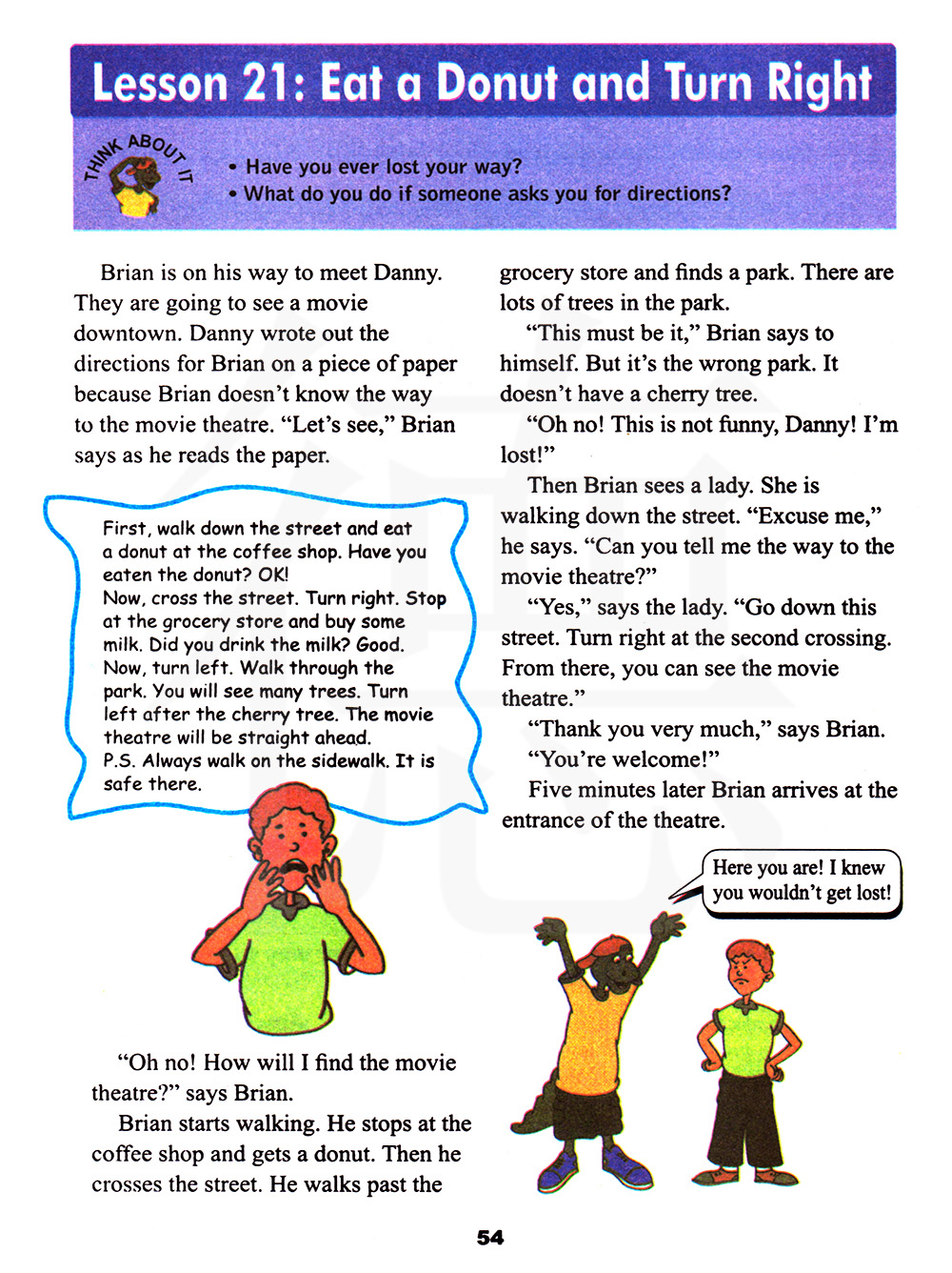 然后布赖恩看到了一位女士,她沿着街道走着,''打扰了,''他说,''你可以告诉我去电影院的路吗?''''可以,''那位女士说,''沿着这条街道走,在第二个路向右拐,在那里你就可以看到电影院了。''