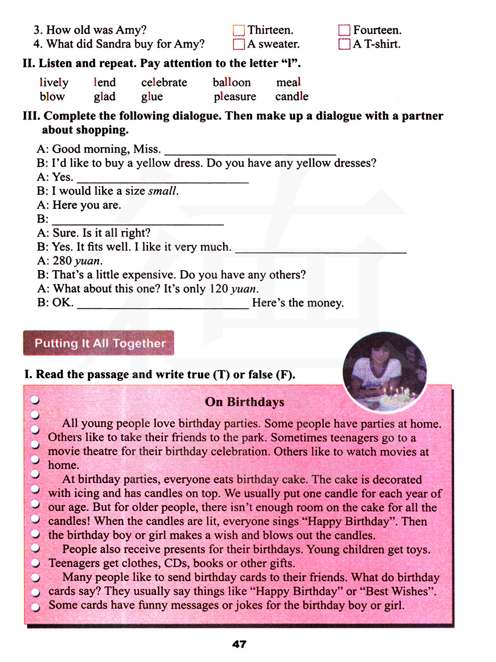完成下列对话,然后和同伴编一段关于购物的对话。