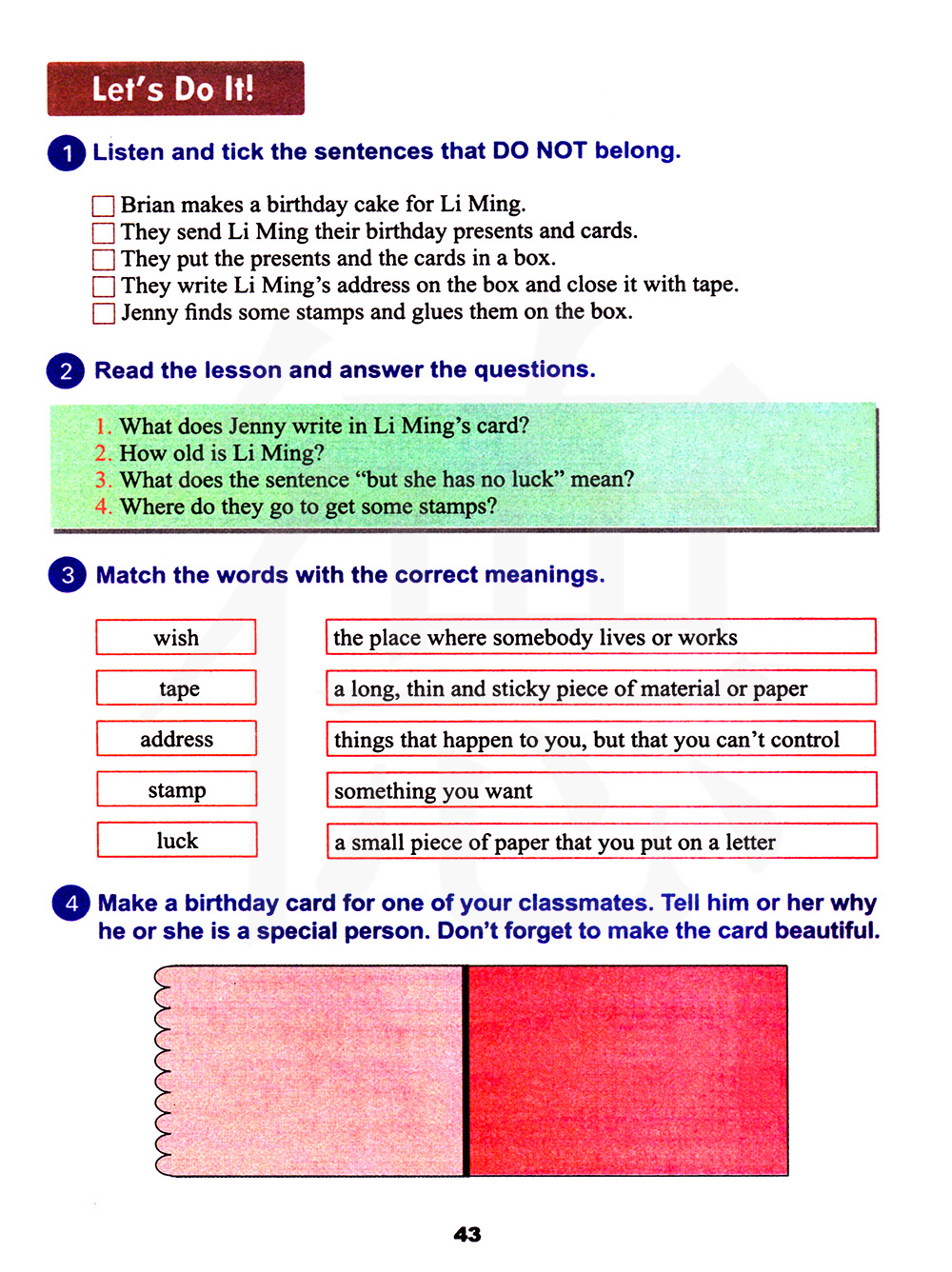 他们把礼物和贺卡放进了一个箱子里。他们在箱子上写上李明的地址并用胶带封口。詹尼找到了一些邮票并把它们贴在了箱子上。