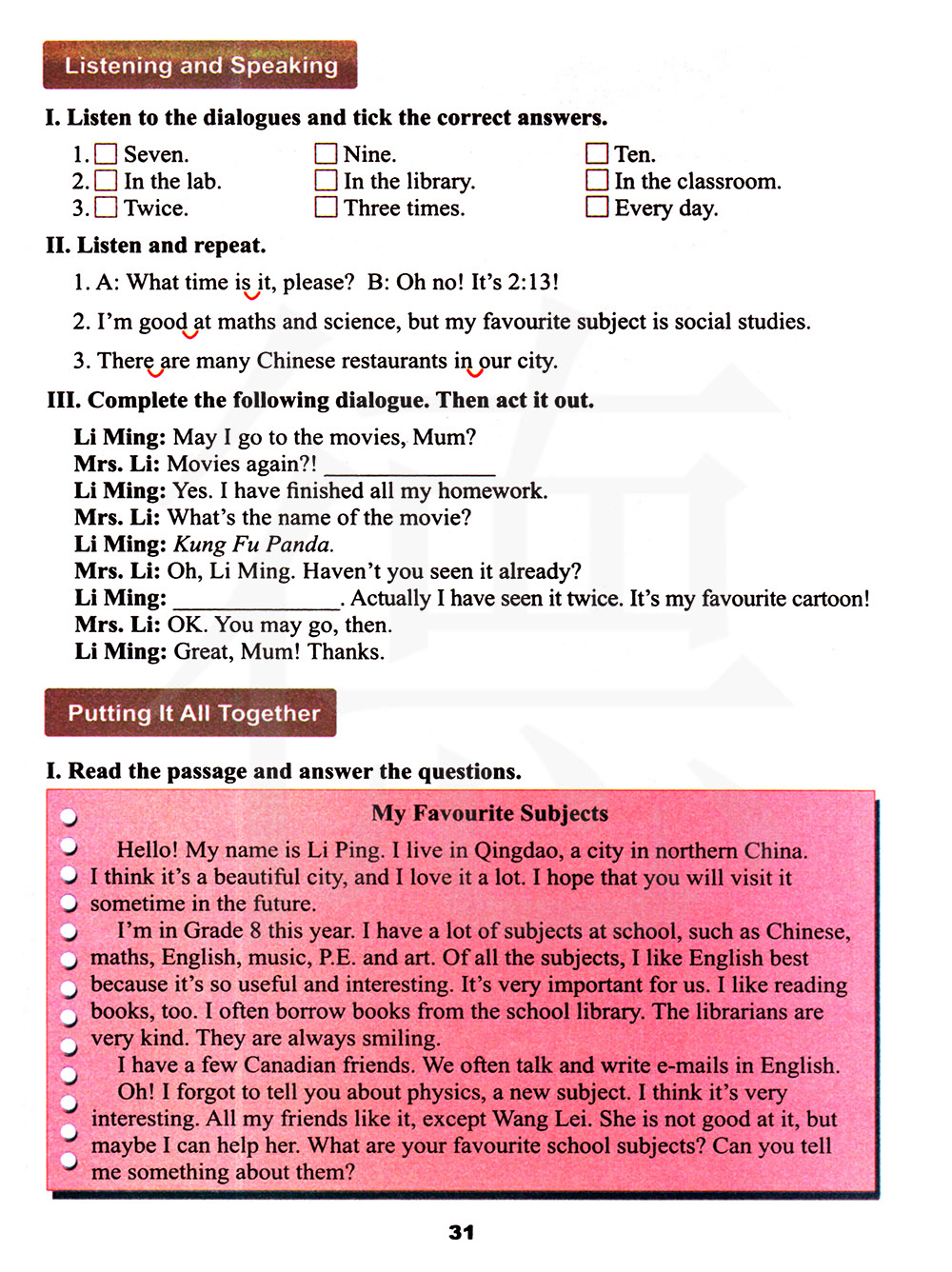 今年我上8年级。在学校里,我有许多科目,例如语文,数学, 英语,音乐,体育和美术。在所有的科目中。我最喜欢英语,因为它很有用且很有趣。它对我们来说很重要。我还喜欢读书。我经常从学校的图书馆借书。图书管理员非常友好,他们总是在微笑。