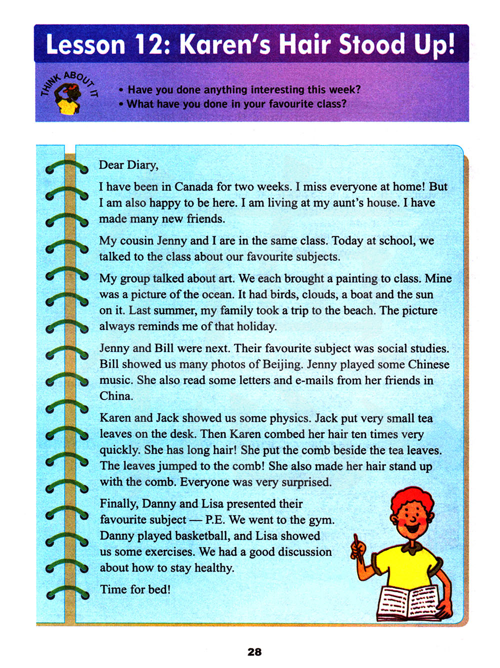 最后,丹尼和丽莎展示了他们最喜欢的科目—体育。我们去了体育馆。丹尼打篮球,丽萨让我们看了一些体操。我们好好讨论了如何保持健康。