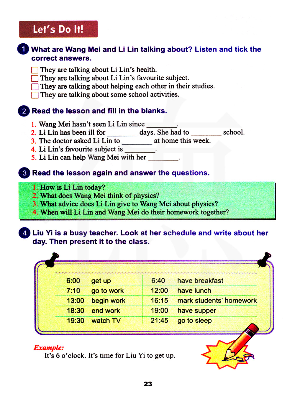 6点起床 7点10分去上班 下午1点开始工作 晚上6点半结束工作 晚上7点半看电视 6点40吃早饭 12点吃午饭 下午4点15批改学生作业 晚上7点吃晚饭 晚上9点45去睡觉