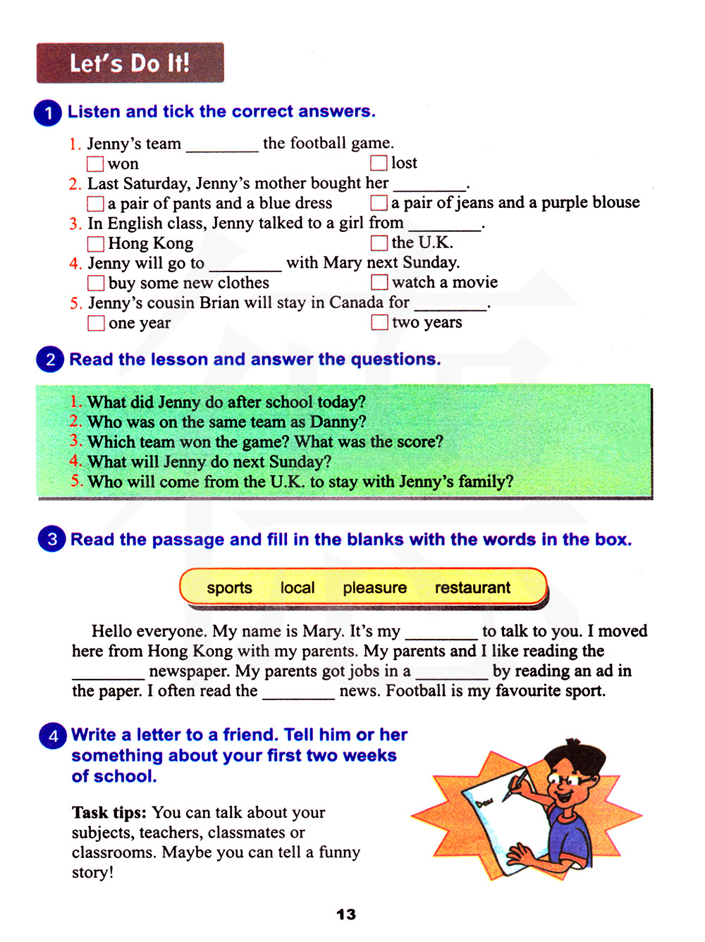 哪一队获胜? 比分是多少?詹妮下星期日要做什么? 谁会从英国来和詹妮一家待在一起?