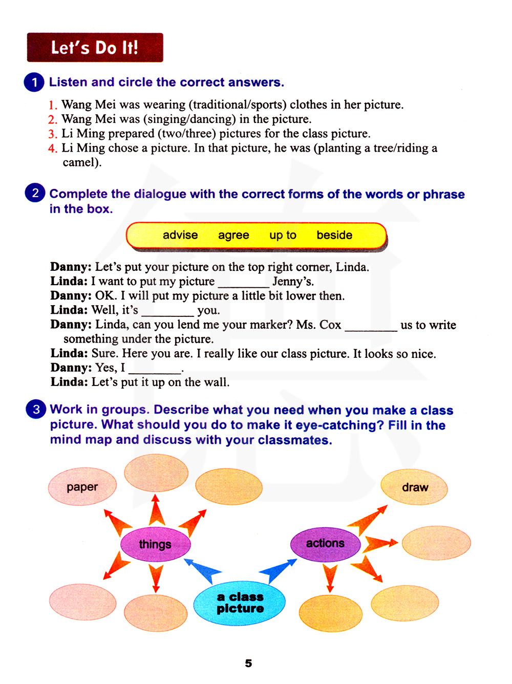 小组活动。描述当你制作一个班级照时你需要什么。你怎样做才能让它抢眼?填入下面思路图并和同学们讨论。