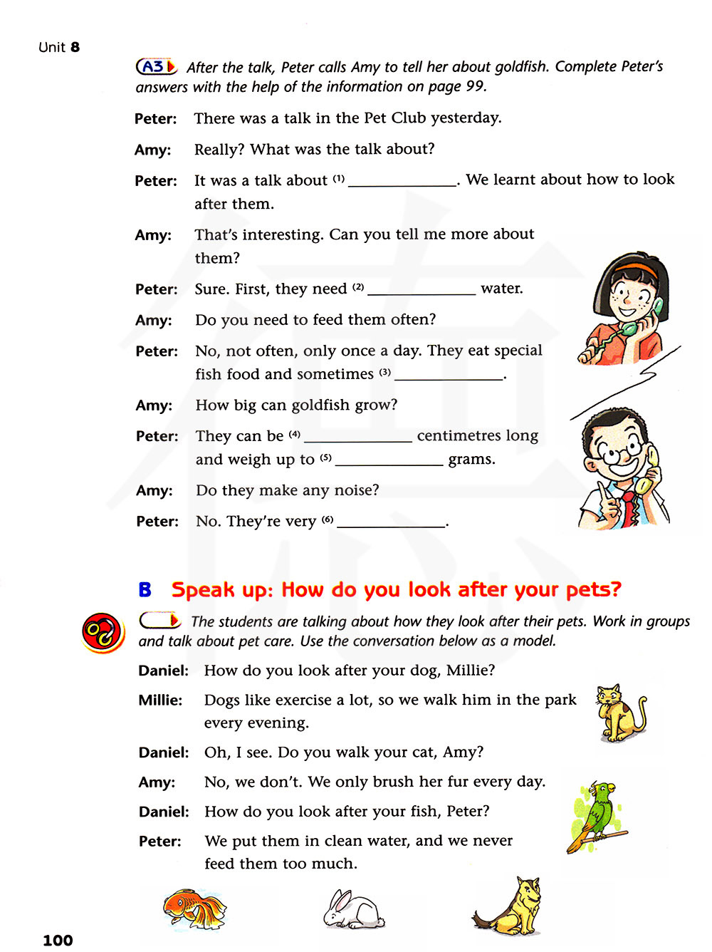 讲话之后,彼得给埃米打电话告诉他关于金鱼的事情。借助第99页的信息完成彼得的回答。