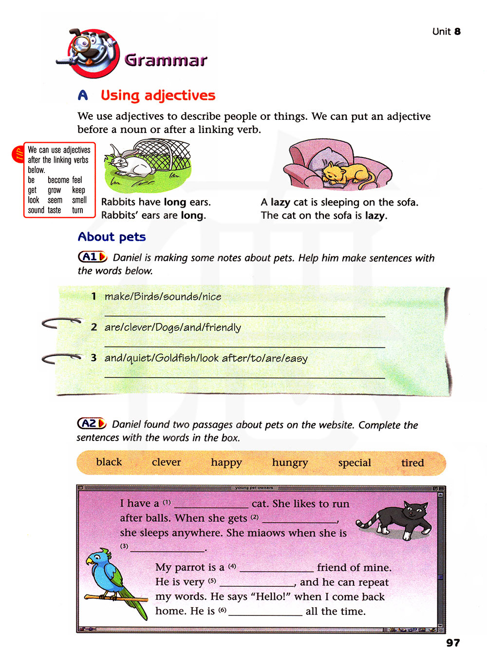 丹尼尔在网站上发现了两篇关于宠物的文章。用方框里的单词完成句子。