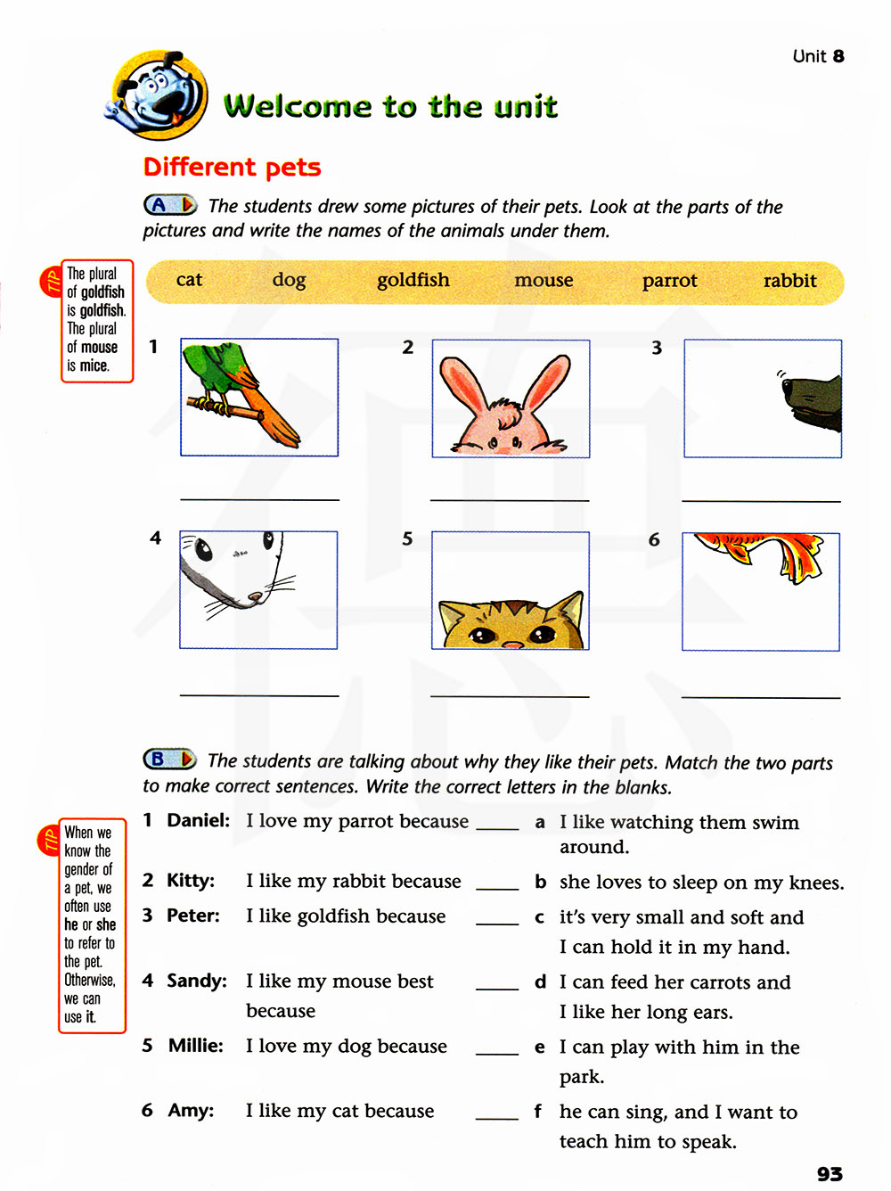 提示 当我们知道一些宠物的性别时,我们经常用“他”或“她”来指代这只宠物。要不然,我们可以用“它”。