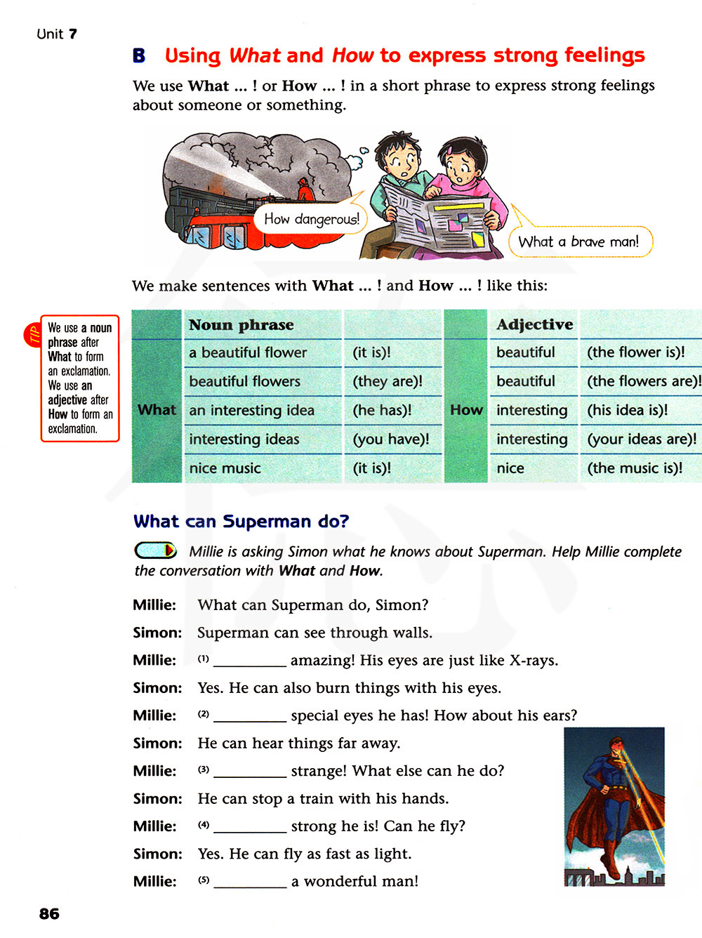 米莉在询问西蒙他知道超人什么。帮助米莉用what和how完成对话。