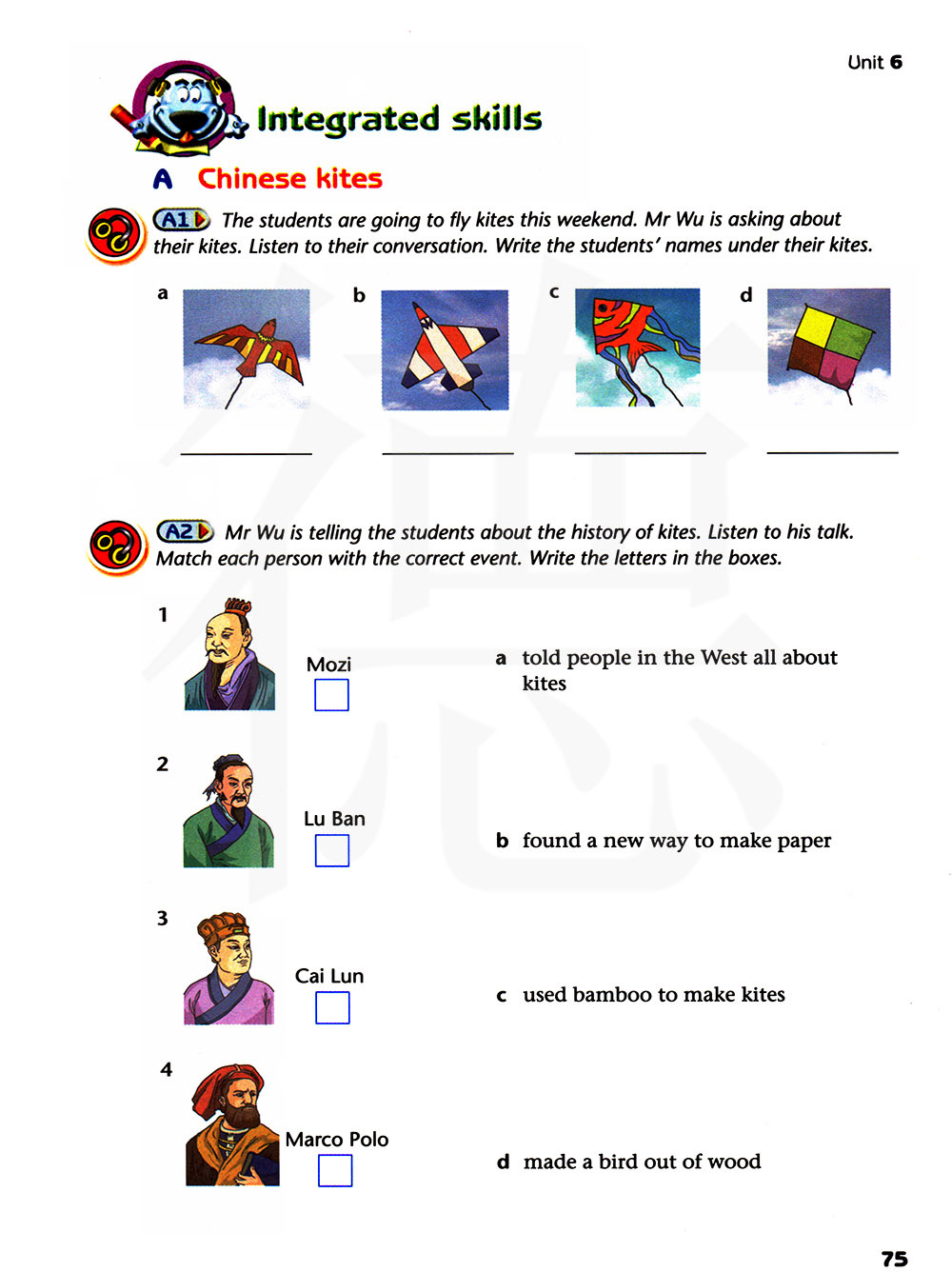 吴先生在给学生们讲风筝的历史。听她的谈话。把每个人和正确的事件连起来。在方框里写出正确的字母。