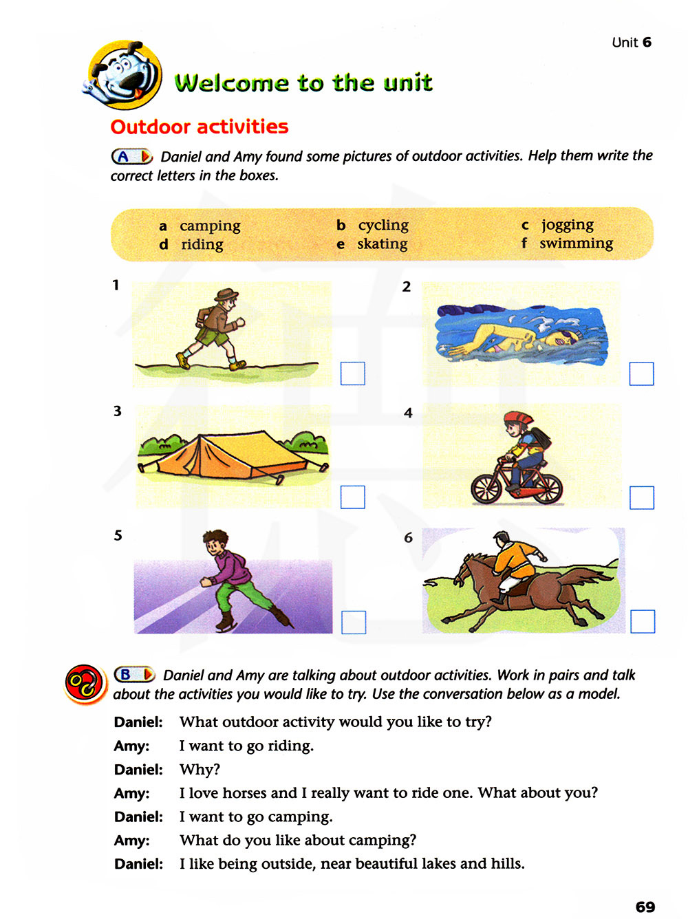 丹尼尔和艾米发现一些户外活动的图片,帮助他们在方框里写出正确的字母。