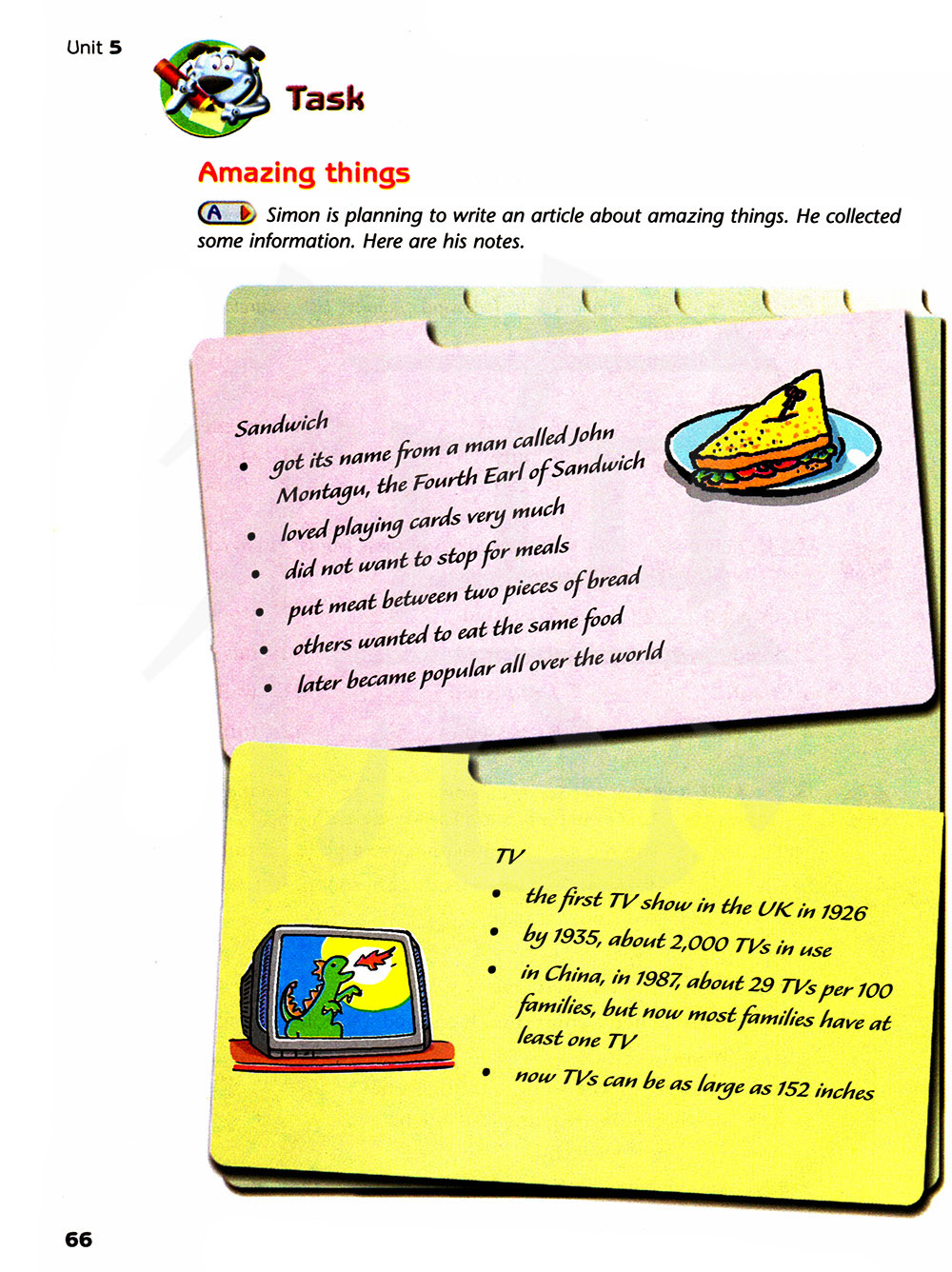 西蒙正在计划一篇关于令人惊奇的事物的文章。他收集了一些信息。这是他的笔记。