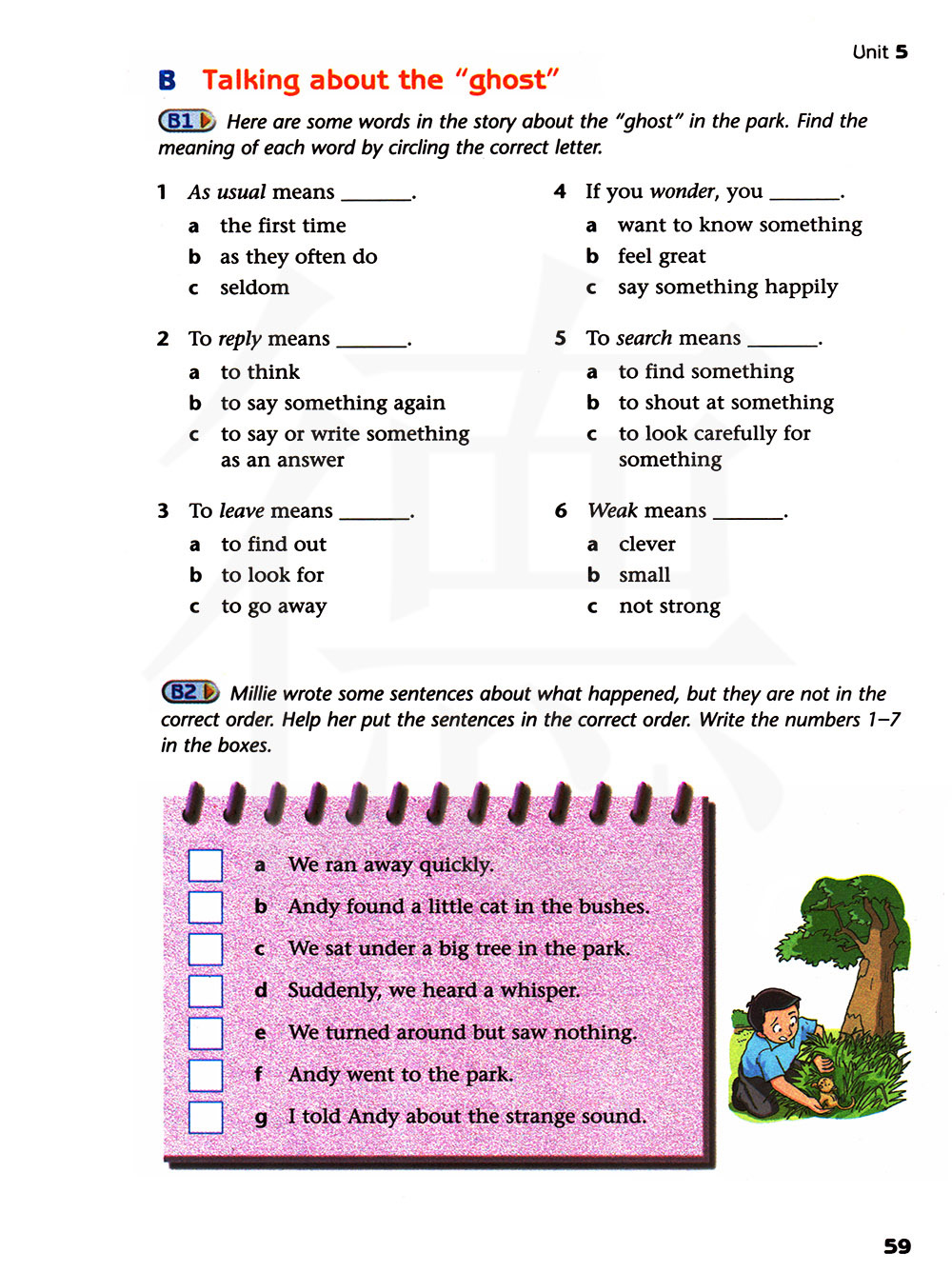 这是故事里有关公园里“幽灵”的一些单词。通过圈出正确的字母来找出每个单词的意思。