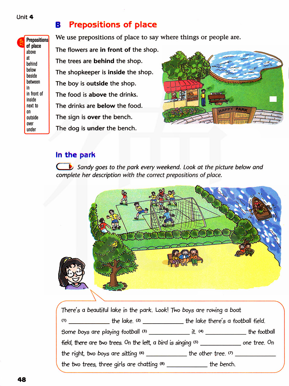 珊迪每个周末都去公园。看下面的图片然后用正确的方位介词完成她的描述。