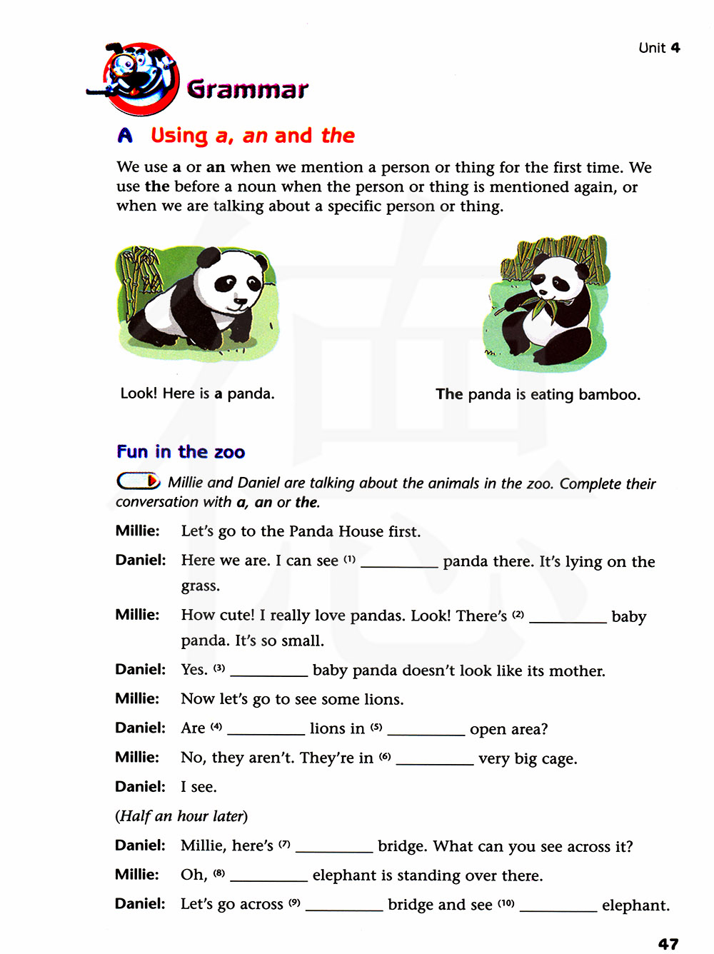米莉和丹尼正在谈论动物园里的动物。用"a","an"和"the"补充对话。
