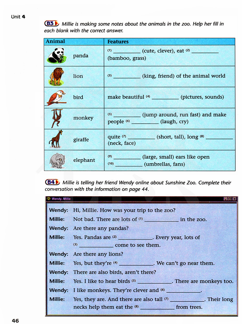 米莉正在网上告诉她朋友温迪一些关于阳光动物园的事。用44页的信息完成他们的对话。