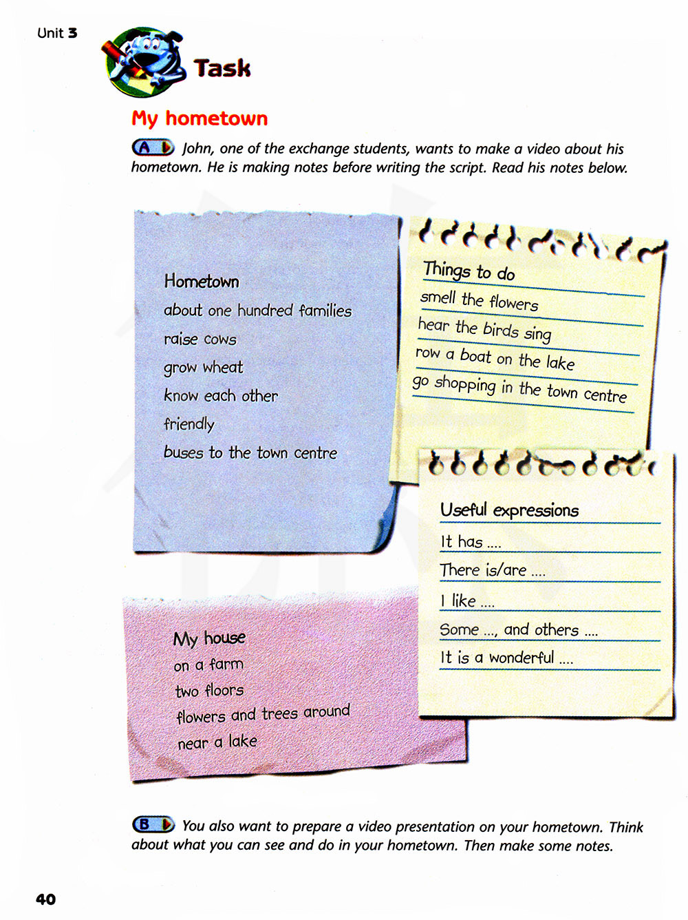 约翰,交流学生之一,想要制作一个关于她的家乡的视频。在他写讲稿之前他正在做摘记。阅读他的摘记。