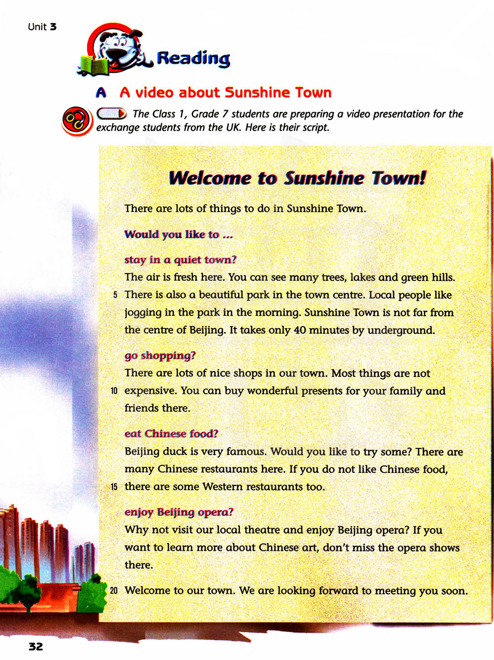 这里的空气很新鲜。你可以看到很多书树,湖和绿色的小山。在城中心还有一个漂亮的公园。当地的人们喜欢早上的时候在公园里慢跑。阳光城离北京市中心不远。乘地铁只要40分钟。