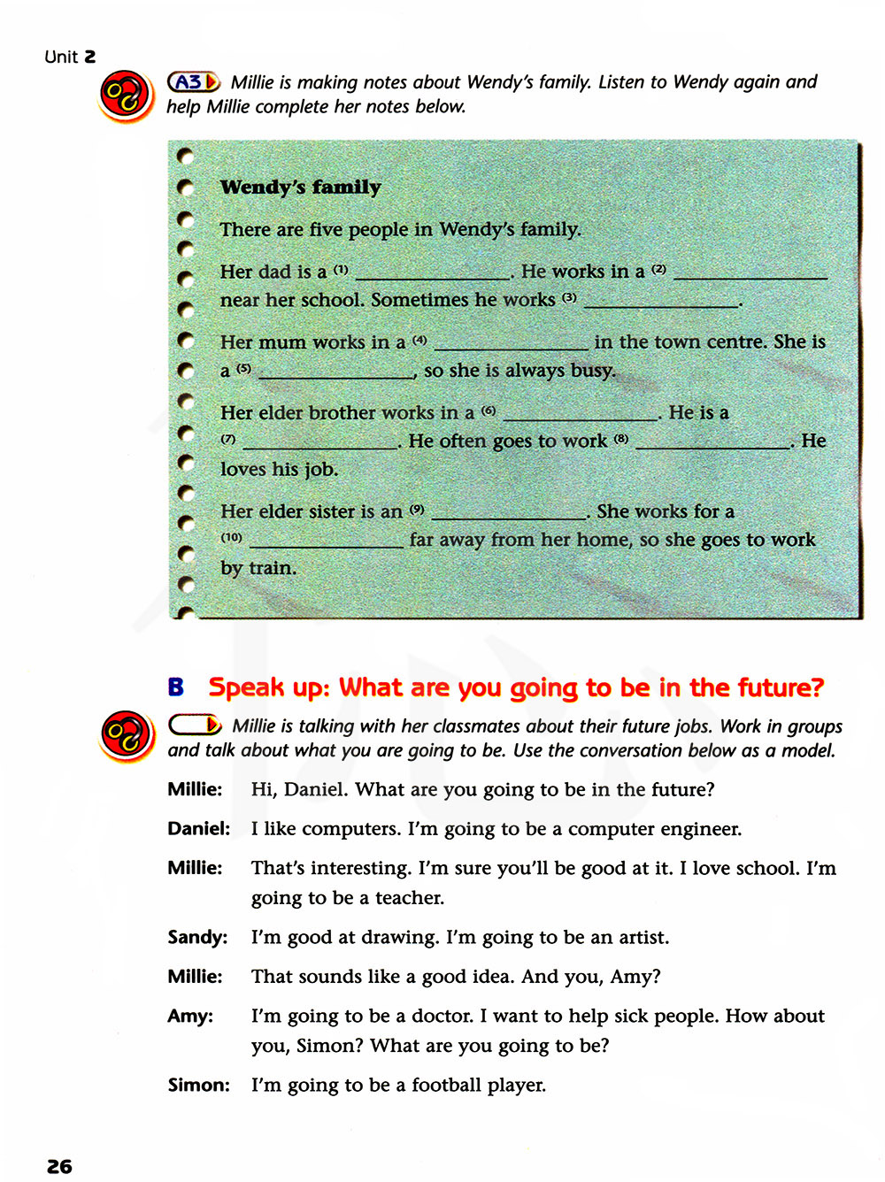 米莉正在和她的同班同学谈论将来的工作。分成小组练习并谈论你将来要做什么。用下面的对话作为一个模板。