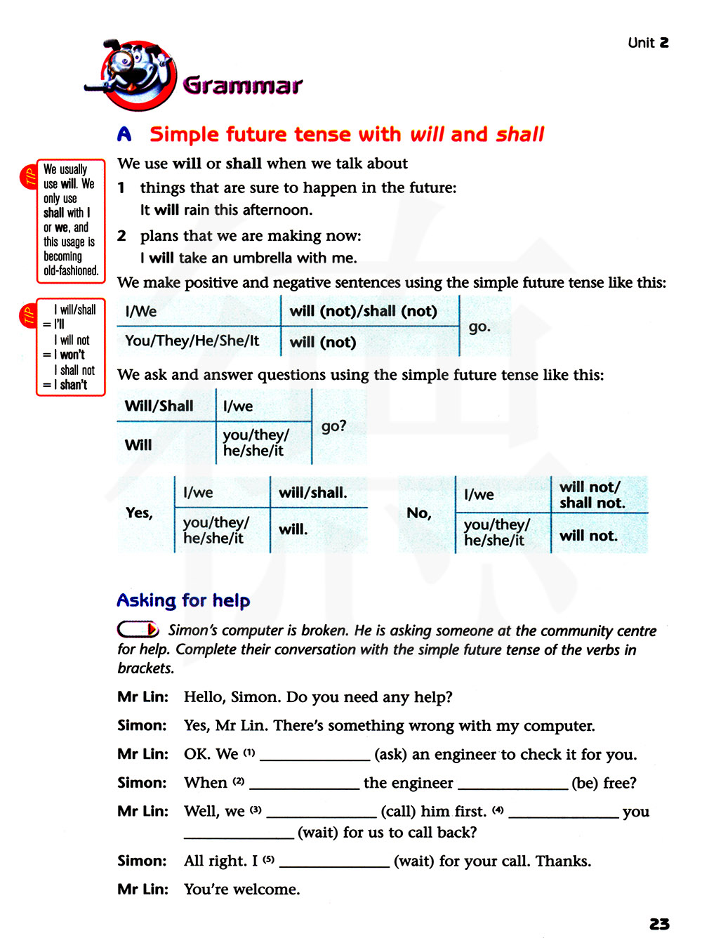 西蒙的电脑坏了。他正在找社区中心的人寻求帮助。用括号中单词的一般将来时态将对话补充完整。