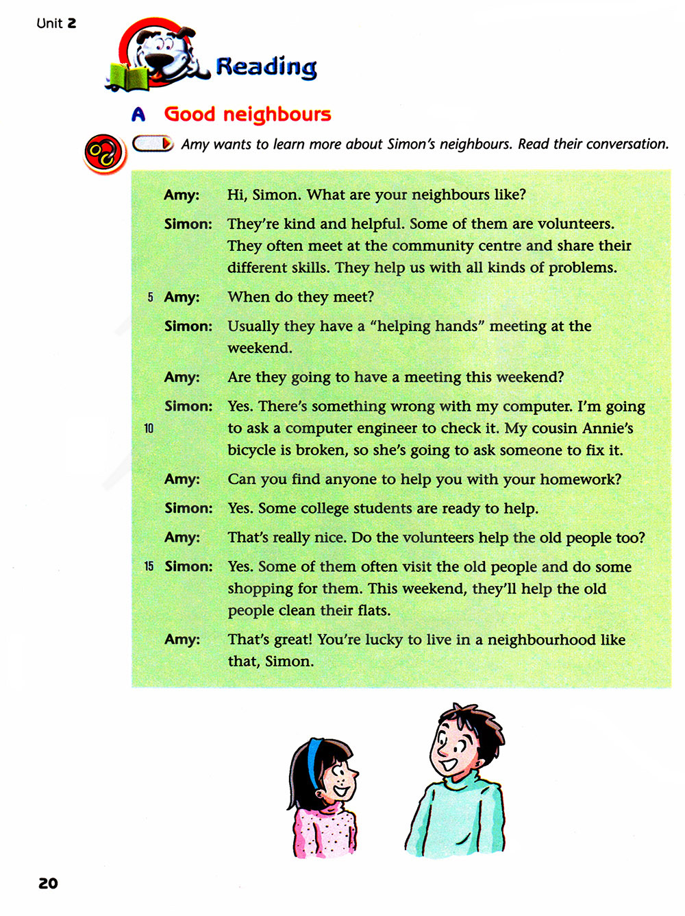 艾米想了解更多关于西蒙的邻居。阅读它们的对话。