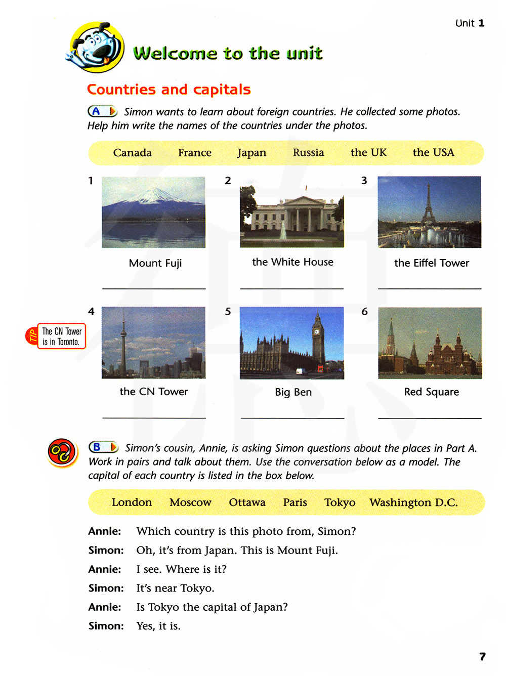 西蒙的表妹,安妮正在问有关A部分一些地点的问题。两人一组然后谈论一下。用下面的对话作为一个模板。各国的首都都列在方框下面了。
