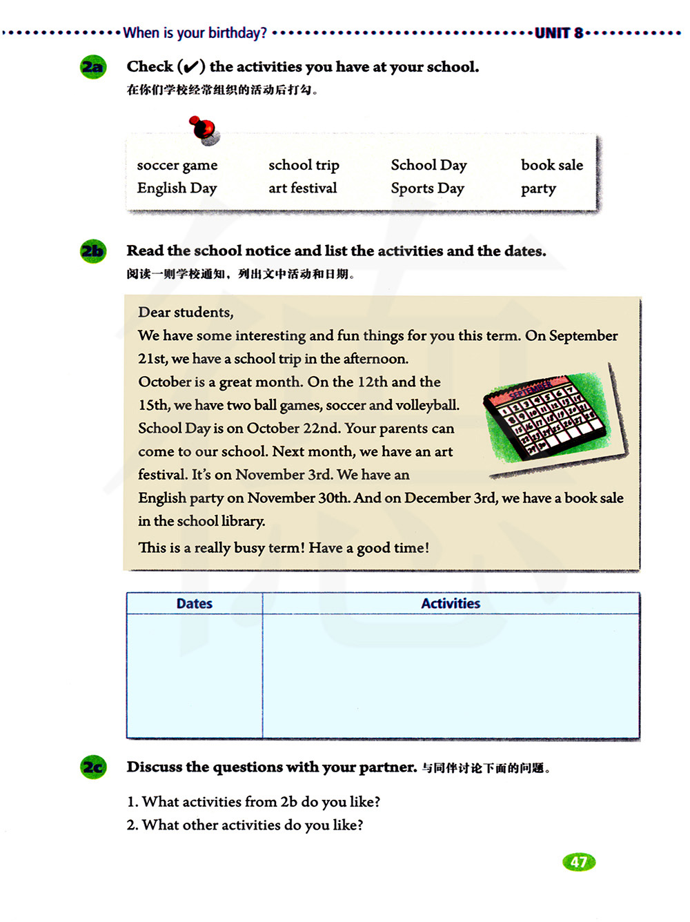 本学期我们为你们准备了一些有趣的事情。在9月21日下午我们进行学校郊游。 十月是一个很好的月份。在12日和15日,我们举办两次球赛:足球和排球。学校庆祝日是在10月22日。你们的父母可以来我们学校。下个月,我们举办一次艺术节。时间在11月3日。我们在11月30日举办一次英语聚会。在12月3日,我们在学校图书馆进行一次售书活动。