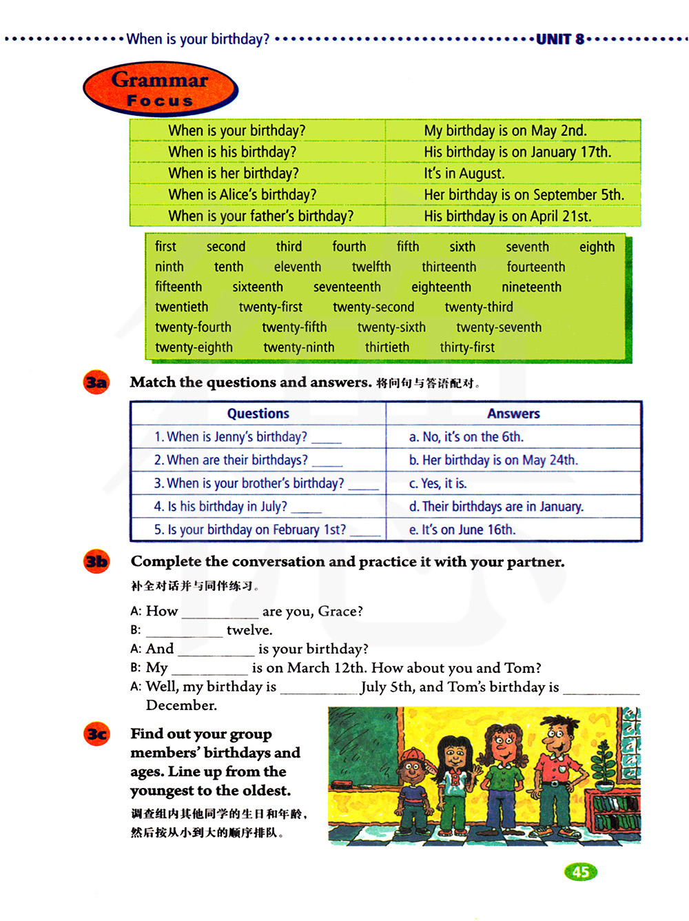 调查组内其他同学的生日和年龄,然后按从小到大的顺序排队。