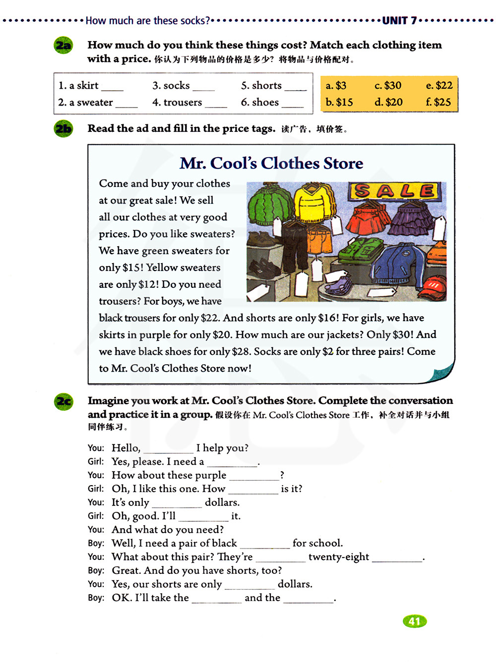 假设你在Mr.Cools Clothes Store工作,补全对话并与小组同伴练习