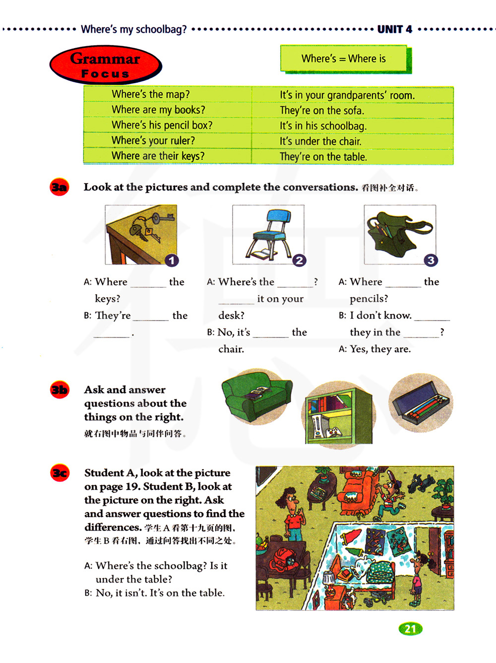 学生A看十九页的图,学生B看右图,通过问答找出不同之处。