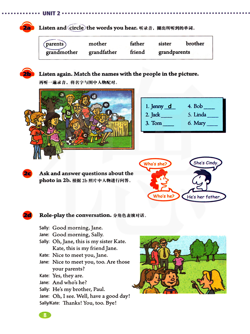 早上好,简。 早上好,萨莉。 哦,简,这是我的姐姐(妹妹)凯特。凯特,这是我的朋友简。 见到你很高兴,简。 见到你我也很高兴。那是你们的父母吗? 是的,他们是。 (还有)他是谁? 他是我的兄弟,保罗。 哦,我明白了。好吧,祝你们玩得愉快! 谢谢!也祝你玩得愉快。再见!