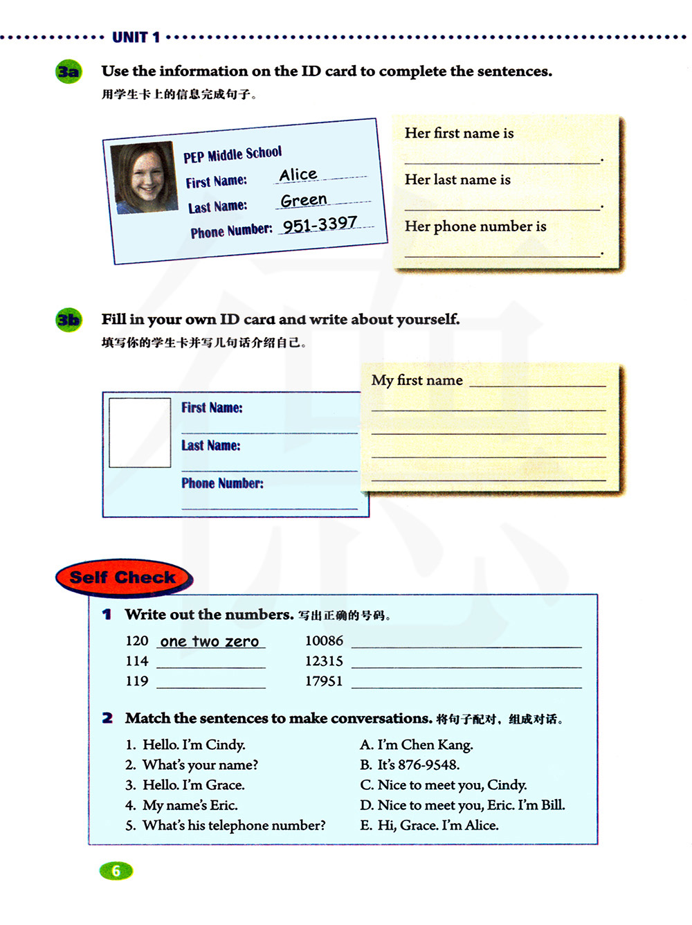 我是陈康。是876-9548。辛迪,见到你我很高兴。埃里克,见到你我很高兴。我是贝尔。你好,格雷丝。我是艾丽斯。