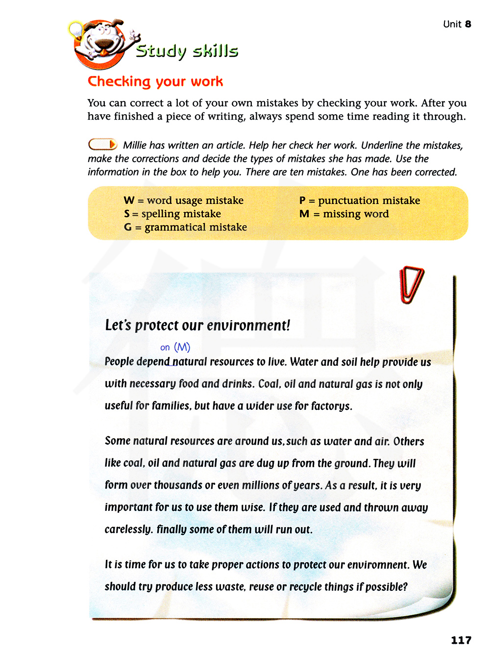 米莉写完了一篇文章,帮助她检查他的作品。在错误下面画线,改正错误并判断他所犯错误的类型。有十处错误,有一个已近被改正了。